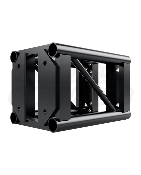 The EVT12S-1½FT Black connects through bolted end-plates, not conical couplers. It shares the same 12-inch square cross-section, chord geometry, and through-bolt pattern as every other EVT12S piece — from the shortest spacer to the longest straight section. 6061-T6 aluminum alloy construction throughout, delivering the same structural grade and load continuity as the 5-foot and 10-foot sections it typically sits between. Unlike spacers, the 2-foot section includes diagonal bracing across its length, giving it full lateral rigidity as a standalone structural segment — making it equally suited as a filler in a long span, a pedestal column, a compact side-stage tower base, or a short overhead bridge between two support points.