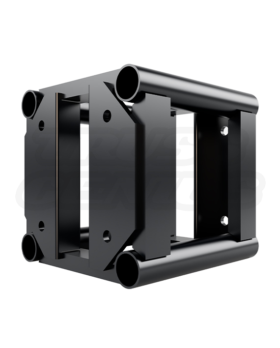 The EVT12S-1FT Black Aluminum Truss Spacer is a one-foot (304.8 mm) spacer in a matte black powder coat finish for 12-inch square end-plate bolt truss systems — the longest spacer in the EVT12S lineup, handling a full 12-inch gap in a single dark-finished component instead of stacking shorter plates. Four 50 mm (1.96 in) OD / 3 mm wall main chord tubes run between two end plates, connected by welded flat gusset panels that hold the 12-inch square box profile across the one-foot span. At 11.46 pounds, this spacer bolts between sections using the standard end-plate connection and adds exactly one foot to the run. Fabricated from 6061-T6 aluminum alloy and coated in a factory-applied matte black powder coat, this spacer exists for grids where one foot of silver between two black truss sections would pull focus on a broadcast camera, read as a mistake from the festival floor, create a hot spot in a planetarium dome, or reveal the infrastructure behind a themed dark ride — environments where the dimensional problem and the finish problem have to be solved by the same part.