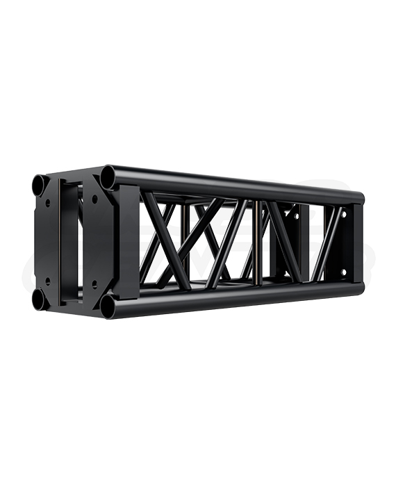 The EVT12S-2½FT Black Aluminum Truss Section is a fully braced 2.5-foot (30-inch) structural segment in a matte black powder coat finish for 12-inch square end-plate bolt truss systems — the mid-range braced increment between the 2-foot and 3-foot sections, coated in a factory-applied dark finish for builds where 30 inches of silver truss between black sections would create an unmistakable break in the grid. At this length, the section is prominent enough in an overhead structure that a finish mismatch is impossible to hide — it sits in the sightline of every audience member in a concert venue, every camera in a scoring stage, every guest in a themed aquatic environment, and every visitor walking beneath a traveling museum exhibition. With full diagonal bracing, main chord tubing at 50 mm (1.96 in) OD / 3 mm wall, and diagonal brace tubing at 25 mm (0.98 in) OD / 3 mm wall, fabricated from 6061-T6 aluminum alloy, this section delivers the same lateral rigidity and torsional performance as its silver counterpart while the matte black powder coat absorbs light across every chord, brace, and end plate.
