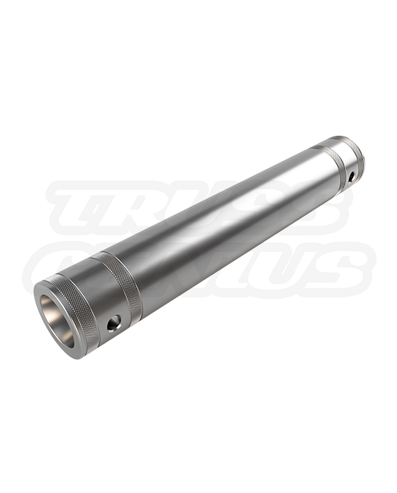 The EVT50A-S305 is a female-to-female spacer — both ends are open receivers that accept standard male conical couplers, which are then pinned and R-clipped into the adjacent truss section’s female chord ends in the normal way. This means the spacer installs between any two points in a 290mm conical system where additional length is needed: mid-span in a horizontal run, between sections in a vertical tower, or at the end of a line where the last standard section doesn’t quite reach the target dimension. The tube itself is 50 mm (1.96 in) outer diameter with a 2 mm wall thickness, matching the main chord specification of standard 290mm square truss systems. Built from EN AW-6061-T6 aluminum alloy and fully F34 compatible, the spacer integrates with EVT290S sections and other major 290mm conical truss brands using the same coupler geometry. The brushed aluminum finish is consistent with standard silver truss components — no surface variation between the spacer and the sections it connects. Male conical couplers are required on both ends and are sold separately.